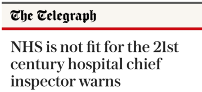 Surfing my FB pages the other day I came across a link to a blog written by Dr Rachel Clarke, a Medical Writer, Feminist and Junior Hospital Doctor from Oxford. Rachel had written this in response to The Telegraph headline below. The story concerned Prof Ted Baker, Chief Inspector of Hospitals (http://www.telegraph.co.uk/news/2017/09/29/nhs-not-fit-21st-century-hospital-chief-inspector-warns/).