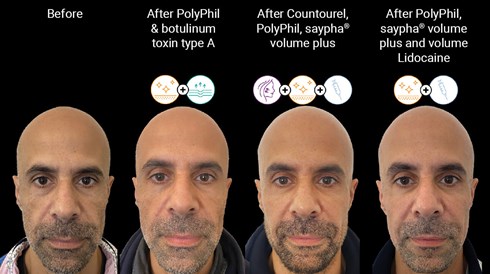 - Additional PolyPhil® eye (1ml per side) and Saypha® volume plus (0.5ml per side) were injected in the under-eye and mid-cheek areas.