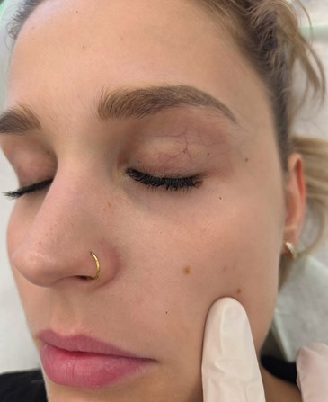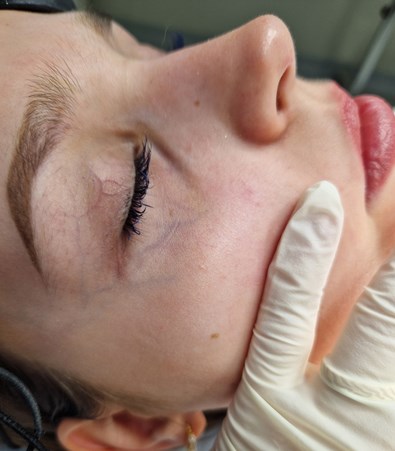 The procedure began with a thorough assessment and cleansing of the treatment area. Protective eye shields – either external or internal – are essential to safeguard the eyes during the session. Laser settings were chosen based on vein size and skin type. In our case, we used Fotona’s SP Dynamis Nd:YAG laser with the R33 handpiece, a 4mm spot size, 20ms pulse duration, and 120J/cm² fluence.
