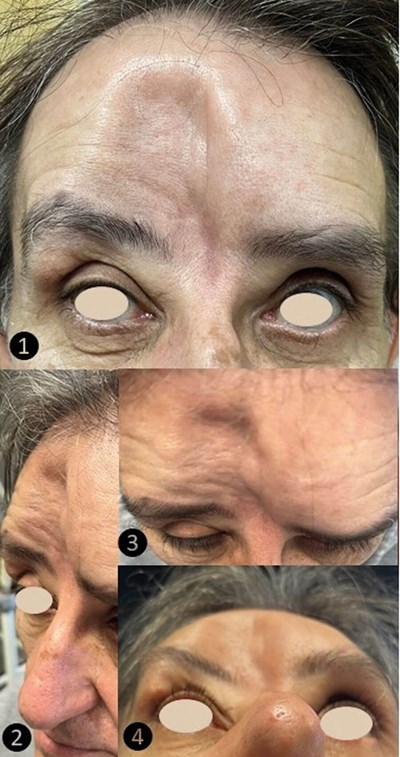 High-energy blunt trauma from a road traffic accident caused comminuted fractures. The bony nasal bridge, superior and medial orbital walls, and a large portion of the frontal bone – completely involving the anterior and posterior walls of the right frontal sinus and partially affecting the left – were destroyed (Figure 1,3). The severe facial and cranial deformity affected the patient’s quality of life and caused psychological distress and social withdrawal. The outcome of surgical reconstruction was excellent (Figure 4).;
