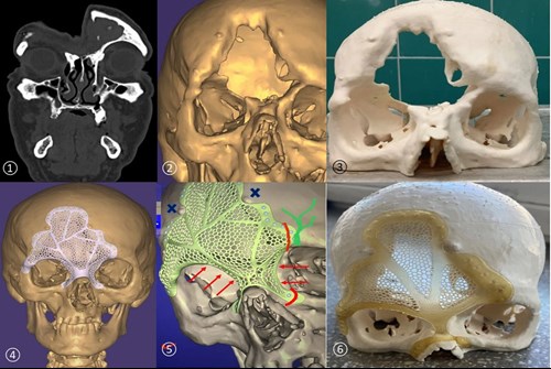 Figure 3: High-resolution CT head scan (1), 3D virtual image of the head (2), 3D-printed skull from inexpensive material (3), patient-specific implant (PSI) designed and virtually matched to restore the bone defect (4), refining the PSI design (5), plastic prototype of the PSI paired with the plastic skull to simulate the surgical situation (6).
