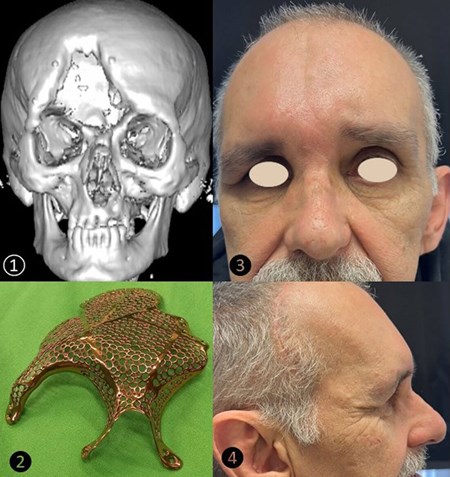 Figure 4: Virtual 3D image of a severe skull bone defect (1), titanium PSI used for reconstruction (2), frontal (3) and lateral (4) views of the patient one year postoperatively.