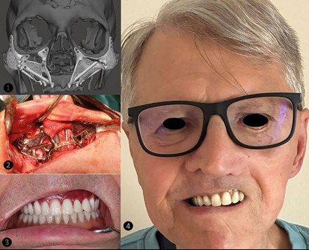 Figure 5: Multiple PSI implants were virtually employed (1) and during the definitive surgery (2) to reconstruct the missing maxillary bones. Dental rehabilitation (3) to restore the hard palate and functions of mastication and speech. The facial appearance of the patient four years post-surgery (4).