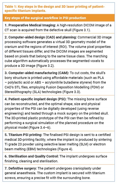 Advances in three-dimensional (3D) printing, or additive manufacturing, allow precise layer-by-layer fabrication of anatomical structures using digital imaging data. In skull bone reconstruction, a virtual 3D model of the patient’s skull can be generated from high-resolution CT scans. The missing or damaged surface is digitally reconstructed through mirror mapping, surface interpolation or slice-based reconstruction under the supervision of the surgeon and engineer [2,3]. A customised implant is designed and 3D-printed to fit the missing sections with sub-millimetre accuracy [4]. The main steps of the PSI production are outlined and listed in Table 1 and Figure 3.