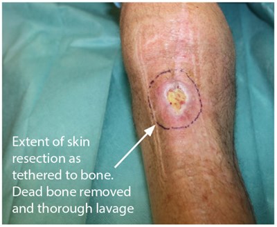In this operative series, there is a skin and bone defect in the upper anterior tibia (Figure 4). The bone is excised and the defect irrigated. The surrounding scarred and adherent skin is excised to create the soft tissue defect (Figure 5).