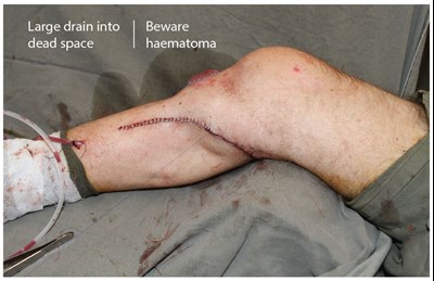 At this stage the muscle is returned to the anatomical position and the tourniquet deflated. After appropriate haemostasis, the muscle is transposed and the leading edge is fed under the elevated skin defect margins. The muscle is fixed with three or four ‘U’ absorbable sutures (I use 3.0 vicryl). These can be inserted and cut and clipped before tying. The muscle is then covered with a split thickness skin graft that can be fixed with glue (Figure 11). The medial incision is closed over a large drain (Figure 12). Typically, the graft is covered with a non-adherent dressing and the leg dressed with wool and crepe. As always, the catechism, ‘tight but not too tight, loose but not too loose’ applies and bandaging must include the foot.